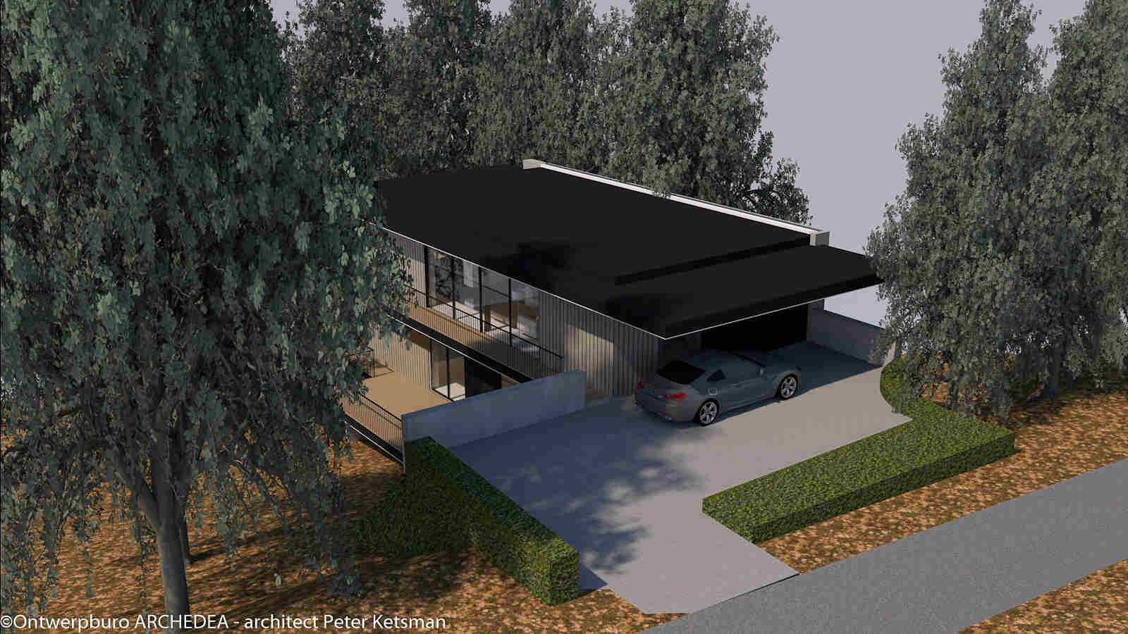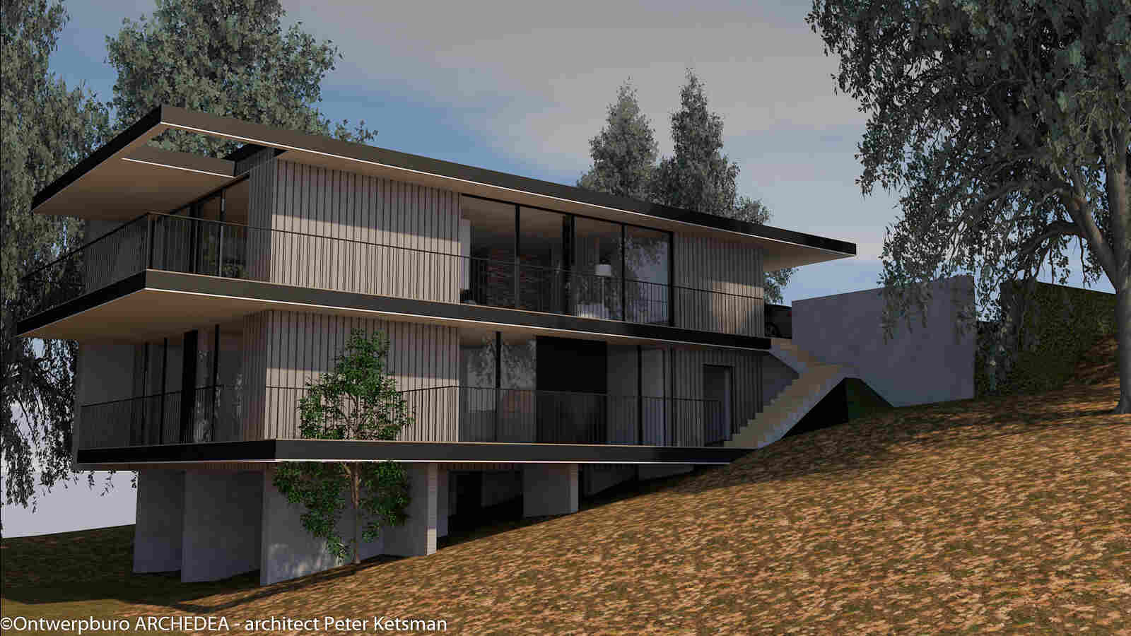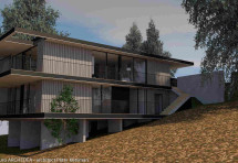 Deze eengezinswoning in Rotselaar werd door de architect volledig geïntegreerd in het hellende terrein. Deze integratie zorgt voor een strakke look. Ook de gekozen materialen dragen hier aan bij, zo zal het volledige gebouw ondersteund worden door een metaalconstructie.